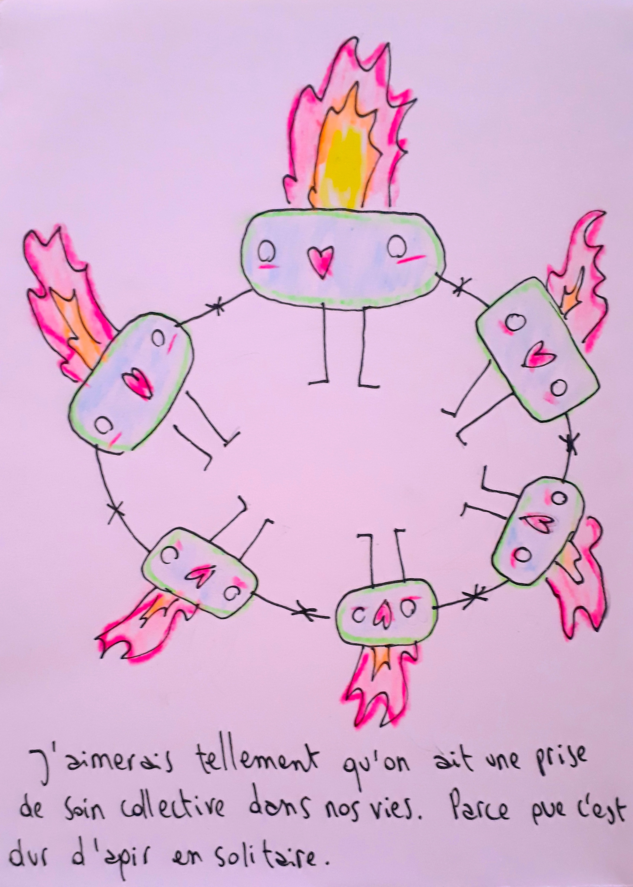 J’aimerais que les hommes de ma vie, mes frères, mes pairs, mes amants, mon entourage entier et oui, j’ose rêver, les hommes du monde entier, perçoivent à quel point leur indépendance n’est que de façade vu que niveau autonomie et travail sentimental ils ne sont nulle part. Et que donc ils profitent de moi. Et de toutes les femmes de leur vie. Qui ont été éduquées/socialisées dans le soin de l’autre, l’écoute, la douceur. Les hommes récoltent le fruit du travail de soin des femmes alors qu’ils participent à semer les graines de nos mal-êtres. Celui de ne pas être eux donc d’être moins bien. Satanés mécanismes ingérés qu’on n’ose pas nommer. Sexisme intégré dans nos psychés. Impossible à déloger à sans y travailler, sans être accompagné.