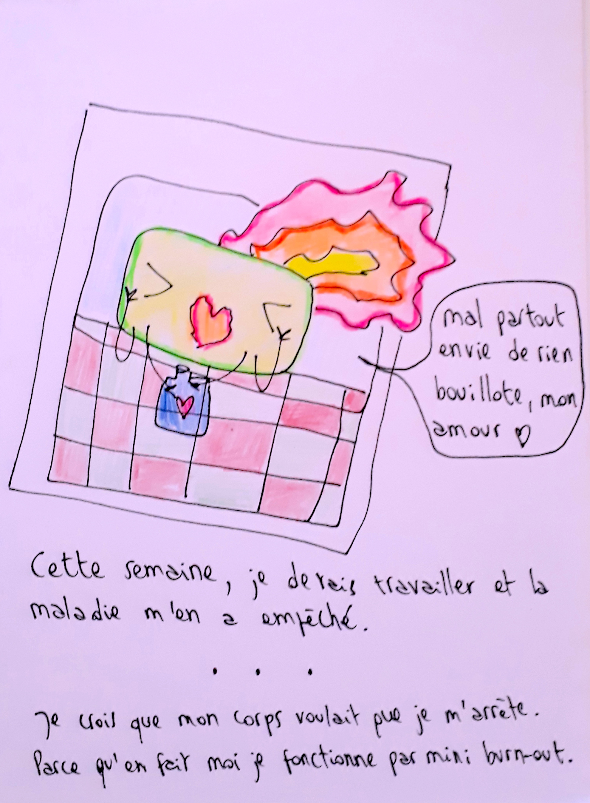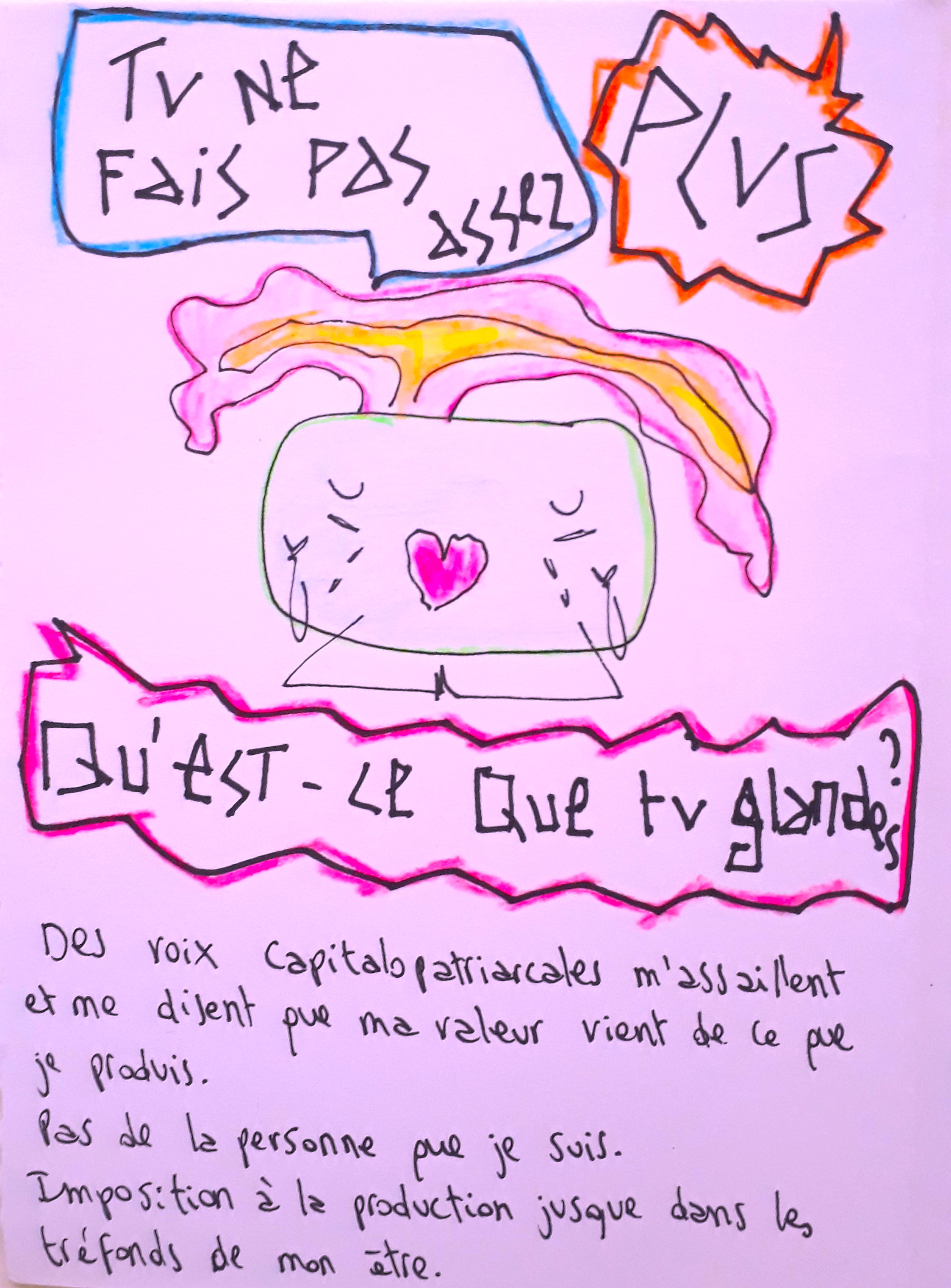 Actuellement, j’ai fait le bilan de ce travail de soin que je poursuis. En 3 ans, j’aurais dépensé 2500€, passé 90h en travail psy (estimation clairement à la baisse, qui n’inclut pas les stages d’auto-défense et les soins informelles données par les copaines).